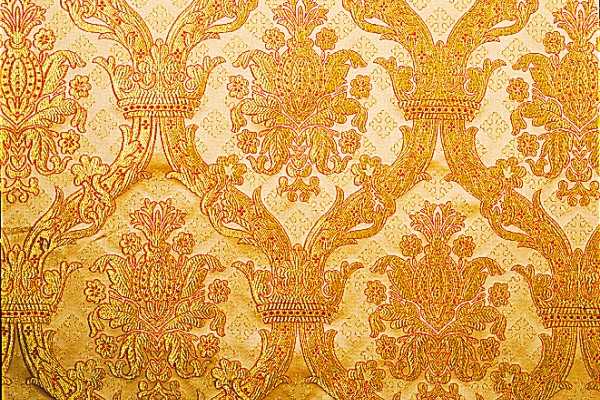 Rich fabric woven with threads of silver and gold, brocade.