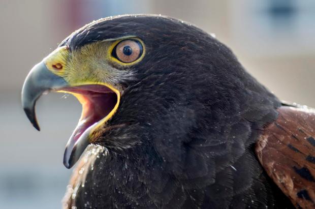 A large species of hunting hawk. The royal falcon. It has yellow eyes and it is a female bird.