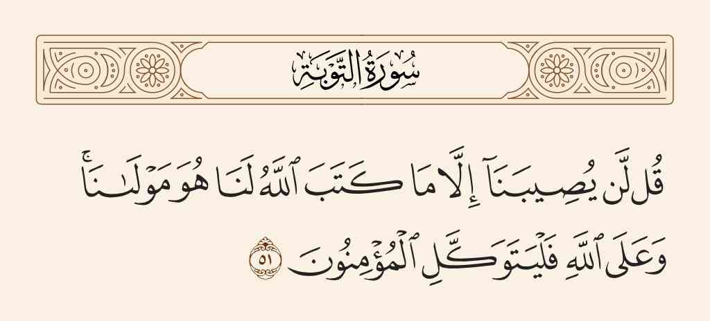” توهان چئو ٿا تہ اسان تي ڪا بہ مصيبت نہ آئي آهي سواءِ ان جي جيڪا الله اسان لاءِ مقرر ڪئي آهي.“ (قرآن مجيد جي سورہ التوبہ جي آيت نمبر 51 ھو پھريون حصو)