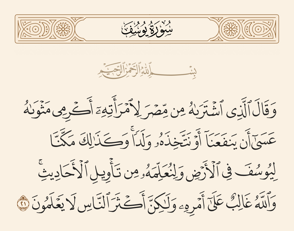 ”۽ الله کي سندي ڪم تي مڪمل اختيار آهي (قدرت رکي ٿو).“ (قرآن مجيد جي سورہ اليوسف، آيت نمبر 21)
